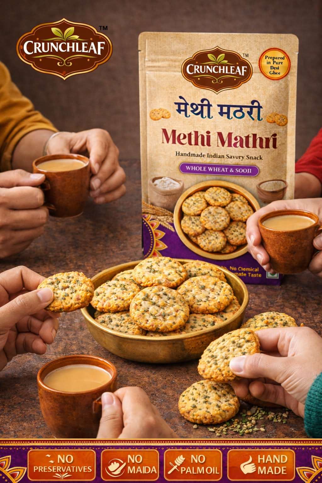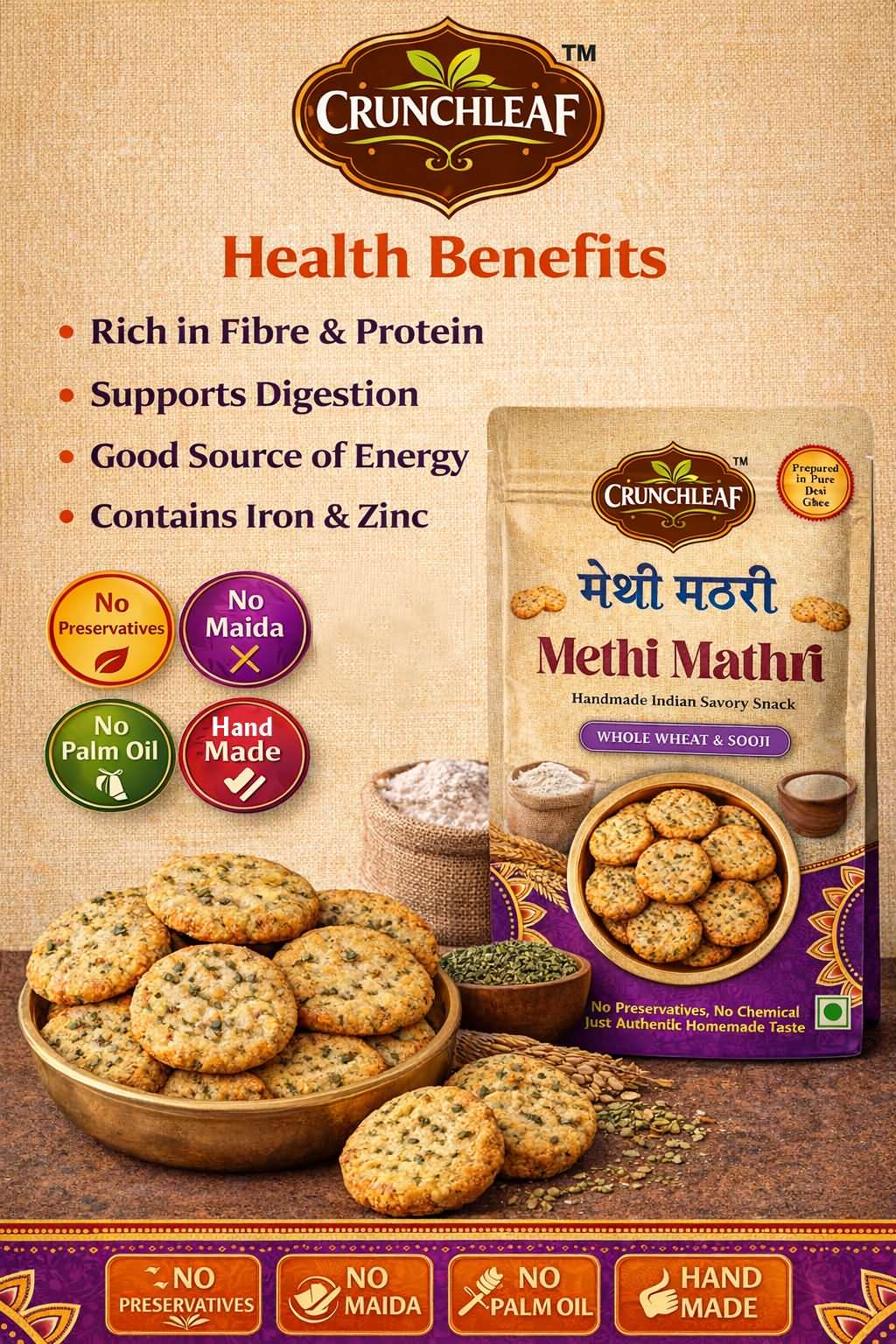 Crunchleaf Methi Mathri is a wholesome, crunchy snack that blends authentic Indian flavors with mindful ingredients—just like homemade.