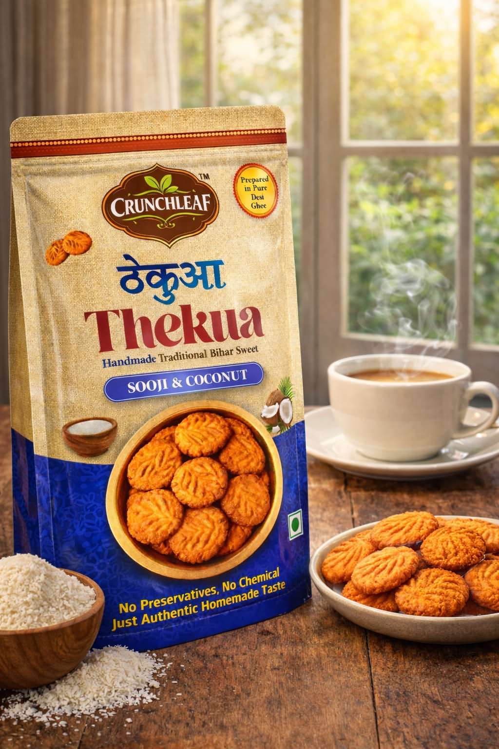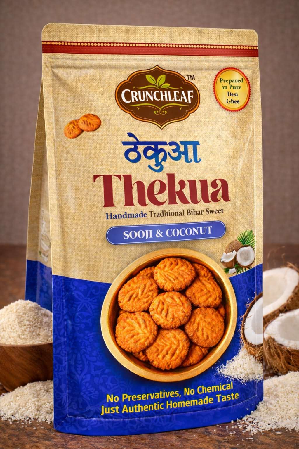 Prepared by Crunchleaf, this Sooji & Coconut Thekua stays true to authentic recipes while meeting modern quality standards. Crunchleaf emphasizes clean ingredients, careful sourcing, and small-batch craftsmanship to preserve traditional flavors without unnecessary additives—bringing a nostalgic, homemade taste that’s ideal for festive moments or mindful everyday snacking.